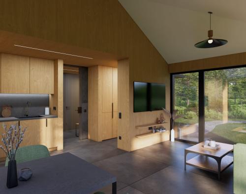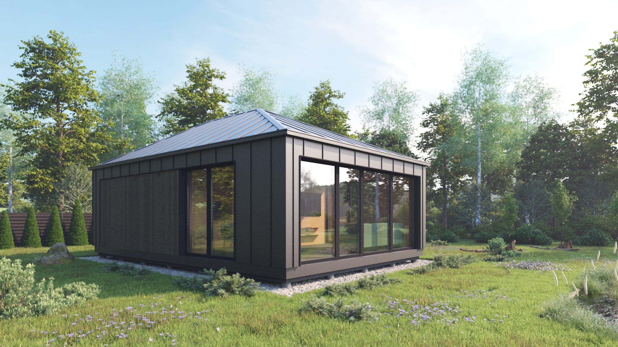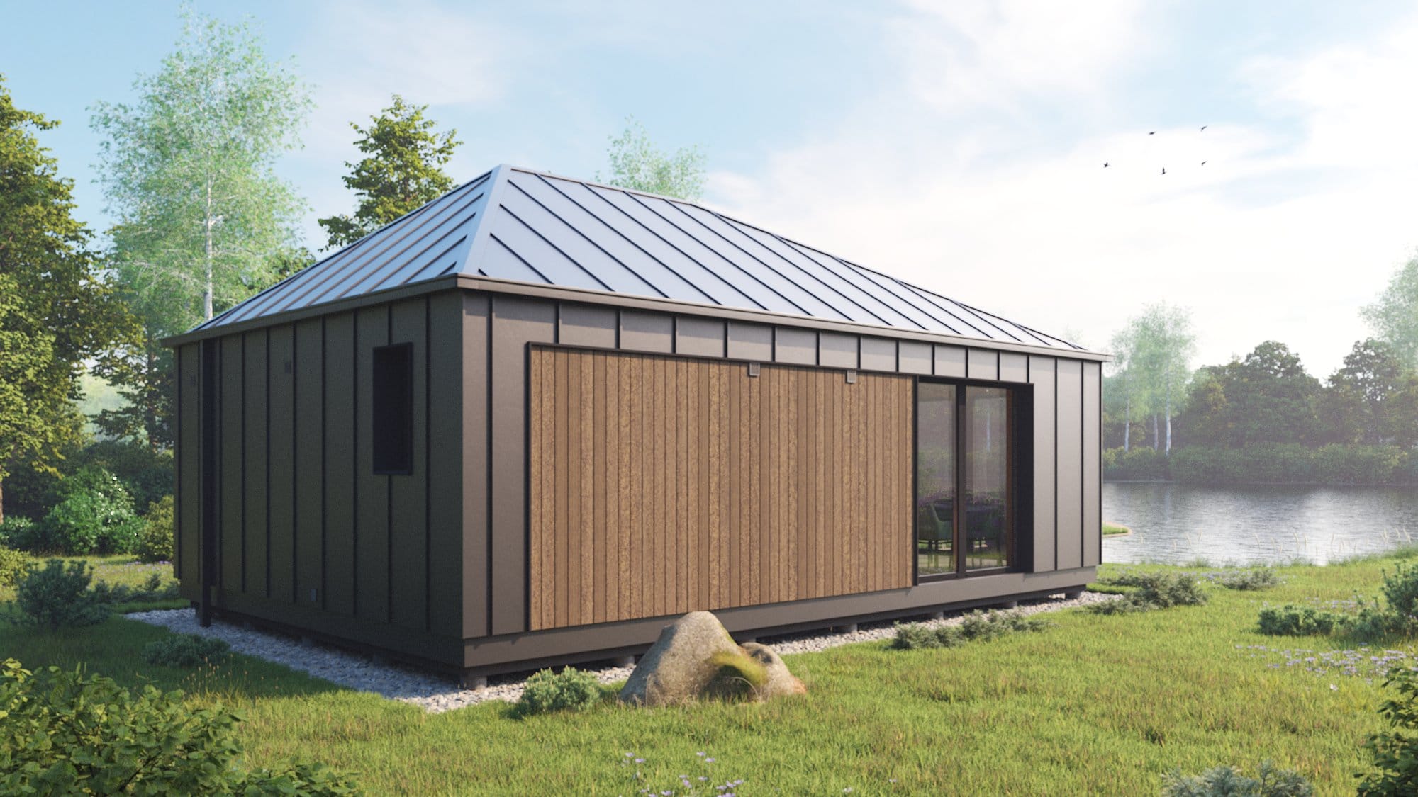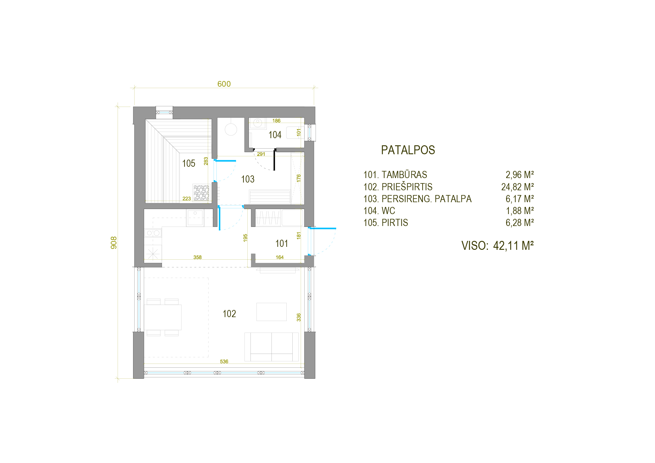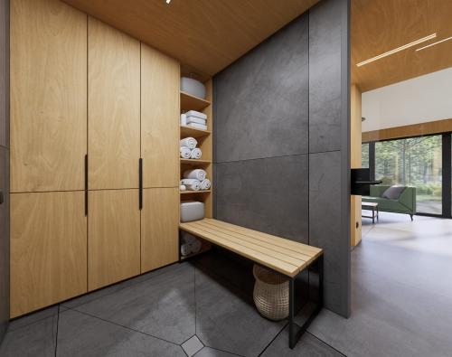 Modernus, kompaktiškas I gr. nesudėtingas statinys – karkasinė pirtis, vieno aukšto, 42m2 bendro ploto su daugiašlaičiu stogu. Numatytas funkcionalus išplanavimas: tambūras, priešpirtis, persirengimo patalpa su dušu, sanitarinis mazgas ir pirties patalpa.
