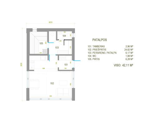 Modernus, kompaktiškas I gr. nesudėtingas statinys – karkasinė pirtis, vieno aukšto, 42m2 bendro ploto su dvišlaičiu stogu. Numatytas funkcionalus išplanavimas: tambūras, priešpirtis, persirengimo patalpa su dušu, sanitarinis mazgas ir pirties patalpa.