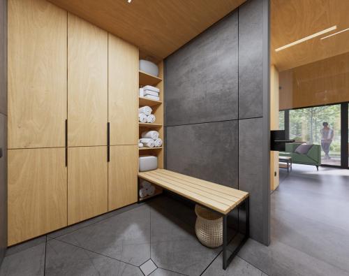 Modernus, kompaktiškas I gr. nesudėtingas statinys – karkasinė pirtis, vieno aukšto, 42m2 bendro ploto su dvišlaičiu stogu. Numatytas funkcionalus išplanavimas: tambūras, priešpirtis, persirengimo patalpa su dušu, sanitarinis mazgas ir pirties patalpa. Prie pastato numatyta terasa su stogine, į kurią patenkama iš priešpirčio.