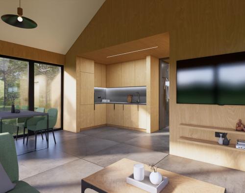 Modernus, kompaktiškas I gr. nesudėtingas statinys – karkasinė pirtis, vieno aukšto, 42m2 bendro ploto su dvišlaičiu stogu. Numatytas funkcionalus išplanavimas: tambūras, priešpirtis, persirengimo patalpa su dušu, sanitarinis mazgas ir pirties patalpa. Prie pastato numatyta terasa, į kurią patenkama iš priešpirčio.